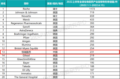 专利是药企最有价值的资产之一,是企业发展的基石,对做原创创新的企业尤为重要。全球专利数据库incoPat创新指数研究中心对2022年1月1日至2022年6月15日公开的全球生物医药产业发明专利申请数量进行统计排名,生物医药产业专利涉及生物技术药、基因工程药物、疫苗、诊断试剂、微生态制剂、血液制品等技术领域。入榜企业/医院主要来自13个国家、组织或地区,罗氏、强生、诺华分别位列前三,PG医药(231件)排名第13位,领跑中国药企。