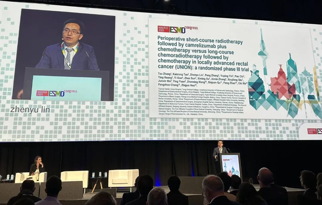 10月21日,PG医药创新药卡瑞利珠单抗的一项研究“新辅助短程放疗序贯卡瑞利珠单抗联合化疗对比长程放化疗序贯化疗治疗局部晚期直肠癌”随机对照Ⅲ期试验(UNION)亮相2023 ESMO大会优选口头报告现场。该研究由华中科技大学同济医学院附属协和医院张涛教授、陶凯雄教授担任主要研究者,华中科技大学同济医学院附属协和医院林振宇教授在大会现场报告了该重磅研究的结果1。此项研究是全球首个评估短程放疗序贯免疫治疗联合化疗治疗局部晚期直肠癌的Ⅲ期研究,已达到主要终点病理完全缓解(pCR),有望为直肠癌患者的治疗提供新策略。